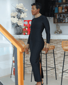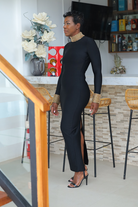 Make an unforgettable entrance. This luxe beaded column gown sculpts the body with premium bandage fabric while shimmering gold detailing adds a high-glam finish. A sleek mock neck and long sleeves balance the curve-hugging fit for a bold yet elegant silhouette.
