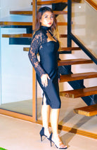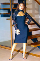 Elegance with an edge. This high-neck lace corset midi contours the body with a structured silhouette while sheer lace sleeves and an illusion neckline add sultry sophistication.