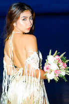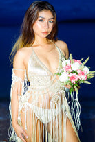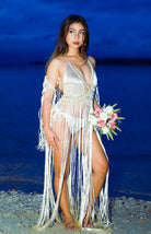 A breathtaking statement for the modern bride. Aura Celeste is hand-knotted in luminous satin macramé, cascading into soft fringe that moves with ethereal elegance. Designed as a one-size silhouette that transitions from ceremony to celebration — effortlessly.