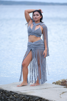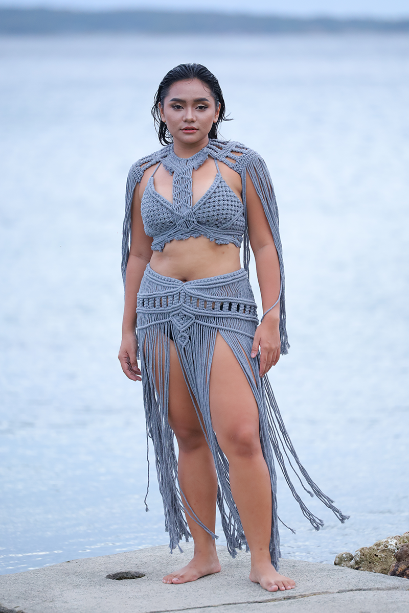 A fierce three-piece macramé statement set — made to command attention. Ares Cinch includes a sculpted halter top, a high-waisted fringe skirt-belt, and a detachable shoulder mantle for dramatic, goddess-level energy.