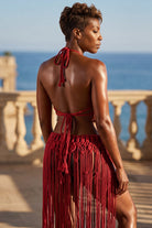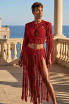 A commanding couture set for the woman who leads the room. Athena Sovereign pairs a high-collar, hand-knotted macramé crop top with a matching fringe maxi skirt — crafted from structured cotton for sculpted, show-stopping presence.