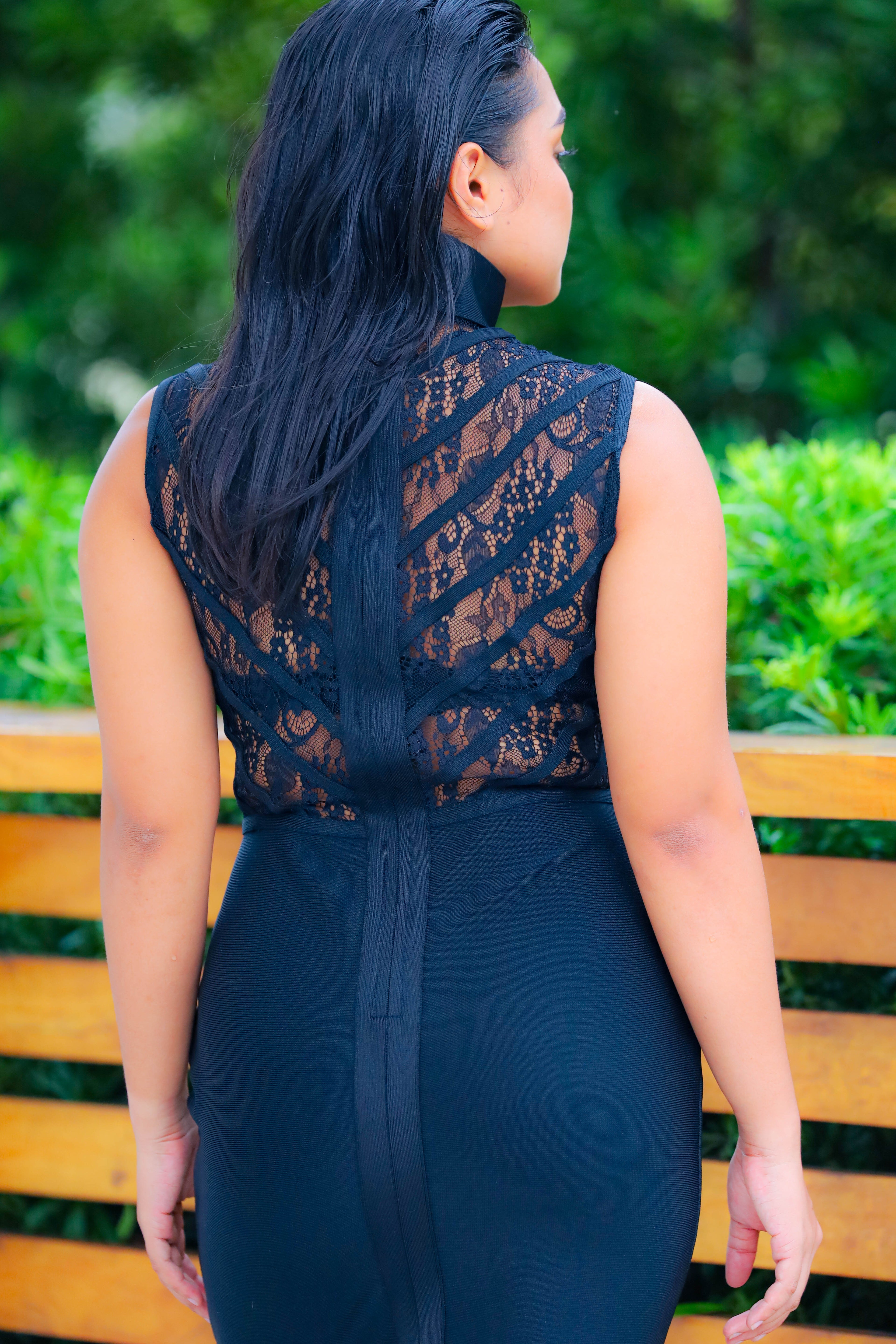 Elegant, sleek, and sculpted to perfection. This high-collar lace-illusion bodice meets a signature bandage skirt that hugs your curves for a sexy, confident, and polished silhouette.